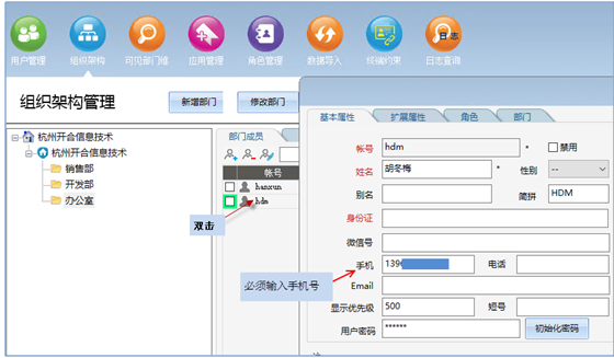 人員維護的時候,需要給賬號設置其手機號碼,該手機號碼與企業微信里面設置的手機號碼要求一樣。這個設置是為了解決Gungho系統與企業微信的單點需求