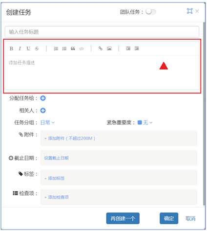 創建任務時必須要輸入的屬性是“任務標題”,如果任務標題無法把任務描述清楚,可以點上圖“創建任務”彈框中的“添加任務描述”,點擊后彈框中會出現任務描述輸入區,如下圖紅色框線區顯示: