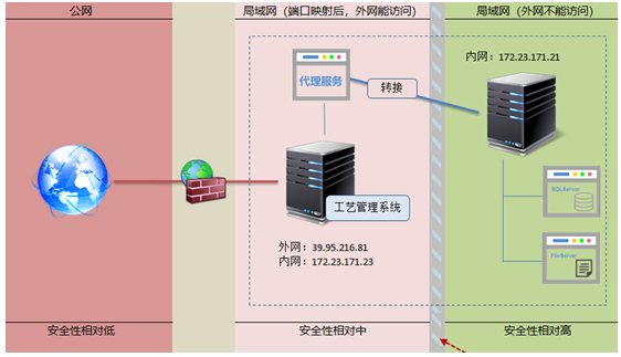 產(chǎn)品生產(chǎn)加工工藝展示系統(tǒng)的APP獨立一臺服務(wù)器,這個服務(wù)器能被外網(wǎng)訪問。系統(tǒng)訪問的數(shù)據(jù)庫及工藝文件在另外一臺服務(wù)器,而這個服務(wù)器是不提供外網(wǎng)訪問的。