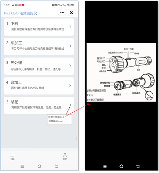 掃描二維碼,后顯示下圖,能查看當(dāng)前產(chǎn)品的工藝步驟,點擊某工藝步驟后 ,查看針對的工藝文件