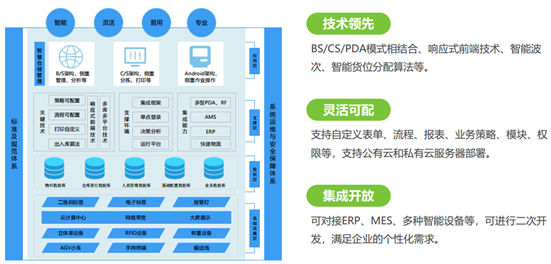 BS/CS/PDA模式相結(jié)合、響應(yīng)式前端技術(shù)、智能波次、智能貨位分配算法等
