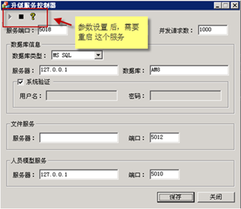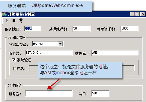 注解: 文件服務(wù)的服務(wù)器地址 (要求在局域網(wǎng)及外網(wǎng)都能訪問的IP地址)若有些用戶沒有外網(wǎng),則就是內(nèi)網(wǎng)能訪問的地址。 (一般我們的升級(jí)服務(wù)與AM8/Mobox的主服務(wù)都是在一臺(tái)機(jī)器上)參數(shù)更新后,需要重啟這個(gè)服務(wù)