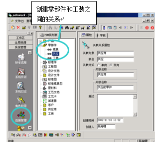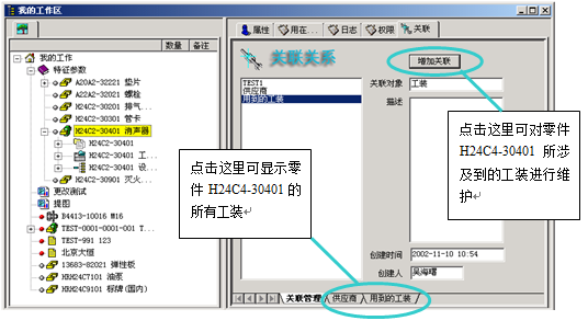 ? ? ? 當(dāng)設(shè)計(jì)人員完成了一個(gè)零部件的設(shè)計(jì)后,其它管理人員可以在”共好”上完善該零部件和工裝等管理信息之間的關(guān)聯(lián)關(guān)系,見(jiàn)下圖: